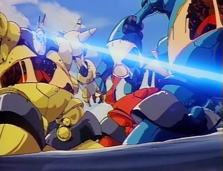 B-Ko sends out one of her friends named Mari, whose physical appearance can only be described as Kenshiro parody, to handle A-Ko. But what B-Ko does not know is that A-Ko has this unexplainable super-human strength and speed that easily defeated Mari, wrecking part of the school in the process. B-Ko does not give up, so for the next few days she designs and builds robots that her other friends pilot in order to continue her mission. Outside of the school grounds, a suspicious looking investigator reports whatever it’s observation to a space ship looming above the Earth’s atmosphere. The ship’s inhabitants appear to be looking for its planet’s long-lost princess. Let me just say that the collateral damage that A-Ko is causing will soon break away from those Graviton High grounds.