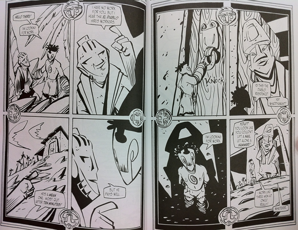 During a friendly drive in the back of a friend’s pickup truck (Joe usually walks everywhere); one of the two children sitting with him asked Joe if he was the Chupacabra. Joe played this off as a joke until the other child called Joe El Bizarron and thus asking for the Devil’s gold he took. Thus we the readers are privy to a retelling of the El Bizarron story; entailing one man’s ability to convince his new employer El Diablo that he welded super-human powers. See, El Bizarron wanted to find work, so he heard that El Diablo was hiring. El Diablo tasked him with jobs that El Bizarron cleverly worked around; convincing him that he had the strength of many men. This soon led to uneasiness which lead to outright fear, leading to El Diablo sending El Bizarron far away by offering bags of gold and a burro (donkey). Thus gives us Joe’s understandable fear of his wife’s final resting place in relation to his past with El Diablo.