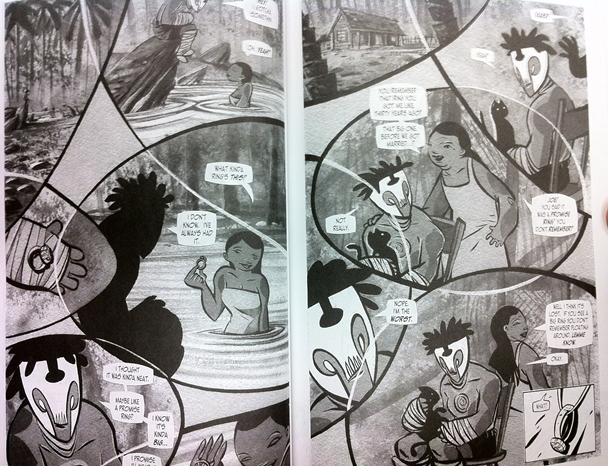 You might have noticed that I have yet to describe what Ancient Joe actually looks like. Joe is a dark-skinned middle sized man with pupil-less eyes and a face hidden by a skull looking face mask that looks like an upside down “W”; black clumpy hair shoots out from the top of his head. He looks like he is perpetually ready to box with his heavily bandaged arms and legs, with a spiral set into his torso. I do believe that the look of Ancient Joe makes him iconic. I cannot say that I care for C. Scott Morse’s other character designs, with their beady soulless eyes. Every human has this unnatural way of looking like they were just possessed by a malicious spirit or are dead inside. To be fair, El Diablo’s appearance of a stone idol is pretty cool.