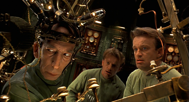 City of Lost Children is very character based and this is helped by the great acting. Mr. One is portrayed by Ron Pearlman, who was the only American in the cast. His character’s brutish but child-like amalgamation speaks in the third-person and is not abased to literally bruising the scenery. This contrasts with his small companion Miette with her stoic and no-nonsense attitude. Evil scientist Krank is snarky and scary, but at the same time likable. Actions bubble wonderfully from Daniel Emilfork’s performance, his villainy controls the otherwise benign fellow clones that live with him, all creations by the same genius scientist, where some look more like fully grown identical sextuplets, one that is the artificial pint-sized scientist’s wife, and a talking head in a jar named Irvin. They follow his lead because they want to see him happy. However, it just happens to that their actions can be construed as evil.