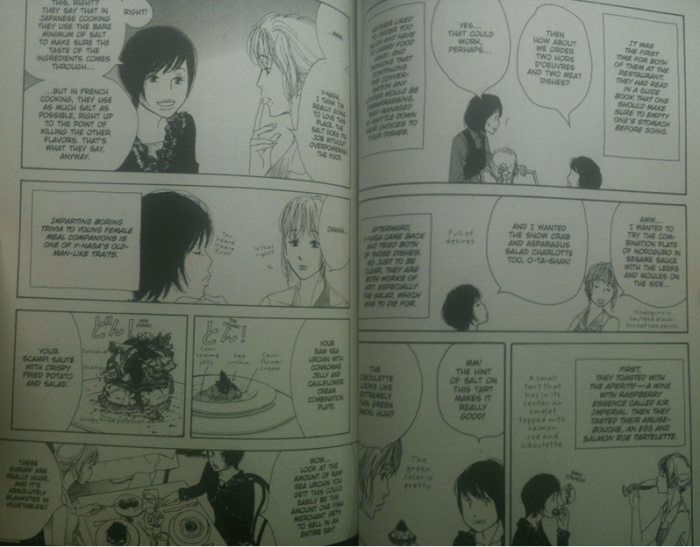 I usually love Yoshinaga Fumi’s artwork, especially her distinctive character designs. Working on things stated earlier, F-mi is portrayed one moment as a (for a better word) frumpy and a visual mess, but when she goes out for research, she is drawn in an almost self-aggrandizing allure of kept hair and full lips. It is nice though to see her try to not lie to the reader that her heavy work load does not place a role in her appearance. Keeping this topic fixated on character designs (as many art related aspects I cover do tend to fall upon) Yoshinga Fumi does fill her works with some of the most glorious woman and men I have ever seen. Only problem for Not Love But Delicious Foods is that she hides these great designs in a plethora of unnecessary dialog boxes reminding you that F-mi’s extremely positive take on food has once again muddled the stories’ plot.