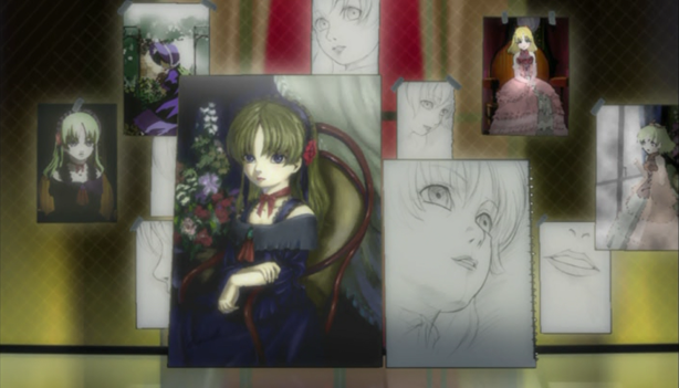 Le Portrait De Petite Cossette is for one headed by anime director, Akiyuki Shinbo who I can without a doubt say has recent titles that readers will recognize. Outside of a ton of nineties OVAs that sit in the “I could swear that I have heard of this before but I forgot where exactly”, he directed Arakawa Under The Bridge, Sayonara Zetsubou-Sensei, and everything under the Bakamonogatari sun. What surprised me the most is just how popular many of these titles are, and to top it off, he directed the heavily talked about anti-magical girl juggernaut Puella Magi Madoka Magica, whose artistic flourishes seem to be taking their first breath in tonight’s review. Interesting thing to note and thus stick in your head uncomfortably, the character designs where done by Hirofumi Suzuki, who with The Sky Crawlers character designer Tetsuyo Nishio represent every single T.V., film, and OVA related to Naruto (Shippuden); small world indeed.
