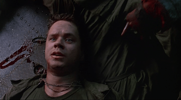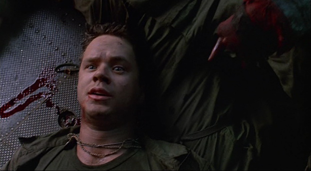 During Vietnam of the seventies, private Jacob Singer (Tim Robbins) barbs crass dick and masturbation jokes with the rest of his platoon. But suddenly as they sit under thatched roofs and suffer the country’s heat, the men start to feel the effect of an unknown affliction. Some scream out in pain as others convulse and hemorrhage on the hard ground. They are attacked, but they seem to be almost fighting themselves. Jacob breaks off into the forest where he is stabbed in the gut with a bayonet; Jacob then wakes up to find himself practically alone on a nighttime train. Once the train stops at the station, he starts to see quick, almost unreal, images cross his vision. These weird things only continue as he tries in vain to leave the station (all the exits are locked); he finally finds a way home by following the tracks home.