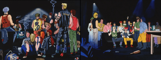 The animation did not seem to fare quite as well this time; whenever backgrounds are involved the movie goes for photorealistic styles, the buildings actually look like they were made of concrete, plants are realistic shades of green such as in the hideout for Shogo’s gang, an old abandoned building with cracked walls, failing electric wiring and the like. All of this would be great, if it weren’t a different style than the one used when there are some characters involved. Take for instance the outlook of the biker gang’s “stronghold” then take a look at its insidesand its inhabitants. It is simply inconsistent. Furthermore, during a rather bizarre scene of violent gore in which space bodies are splattered around like they were made out of plastic, filled with ketchup, and about as durable, followed by eyeballs shooting out with a disregard for the injuries themselves.