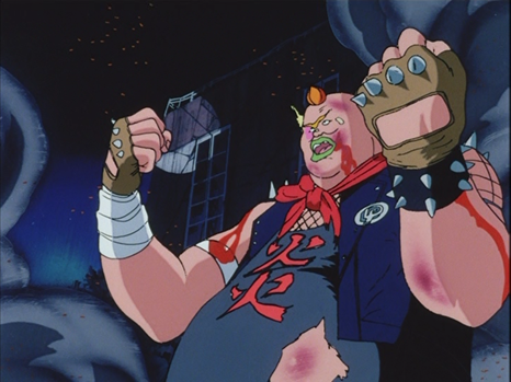 Part 2 of Megazone23 starts a few months after the events of part 1. Shogo was defeated in his attempt at a final confrontation with BD (the military commander whom I affectionately call Blu-ray Disc). After his defeat, Shogo apparently went underground to lick his wounds, gathering some of the most varied assortment of lunatics out there in the world of anime (with the exception of maybe team Dai-Gurren) There is Guts, who is basically a bull in a biker’s get up and bad teeth. Lightning, Shogo’s best friend and second in command, who looks like a goofier Shogo with his multi-colored hair and an interesting attraction for Eve, which sort of made me think of an early parallel for Otaku’s obsessed, with their idols and/or waifus. With company like those two, Shogo lies in wait for an opportunity to strike back. Meanwhile, Yui, our heroine has been sitting around waiting for Shogo to appear, like a good woman of the 80’s is necessentially expected. And apparently she decided to get her hair dyed (which may not have been intentional on her part).