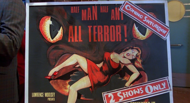 Gene quickly befriends Woolsy, impressing him with his vast monster and creature feature knowledge stemming from stacks of Monster magazine and constant escapes into movies (see, the 60’s were a time where spouting useless knowledge and trivia was commented instead of just avoided). This far into Matinee, the film can be broken up into two parts. The first mentioned so far introducing characters, plot points, and environmental aspects. The second half includes all of those plot points mixing together with MANT’s (oddly) midday premier. No joke, around half of Matinee takes place during a showing of MANT, with all the audience participation features like Rumble-Roma systems and electrically fixed chairs that were all the rage back in the time of The Tingler (whose director, William Castle, provided the inspiration for Lawrence Woolsy). You know, back when liability forms were not as prevalent as they are today.