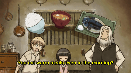 Cons: With a heavy amount of the budget going to backgrounds and period design, the faces on the character models are often distractingly uneven (for instance Claude always looks pissed), which is only a problem compared to how nice everything else looks. A few episodes have dialog audio problems where it either briefly slips into Mono, or some other problem. Cutesy exterior is going to put off potential viewers. First couple of episodes are a little weird when you have French characters like Claude and Oscar speaking fluent Japanese, teach Yuna to speak French, start to all speak French, yet everyone in the end is still speaking Japanese.