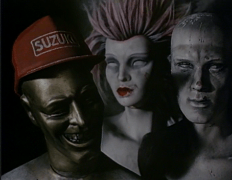 In an abandoned apartment complex, beaten and battered mannequins come to life to enact repetitive tasks. The main male mannequin (the only one whose tasks involve leaving the second floor) seems to be going to work, leaving family members like his wife to repeatedly cook, bathe, play the harp, fix a radio, or even play voyeur to another mannequin. Life is good until a new batch of modern punk styling mannequins show up and party to the point of ruining the older mannequin’s way of life.