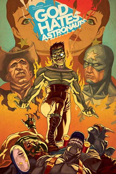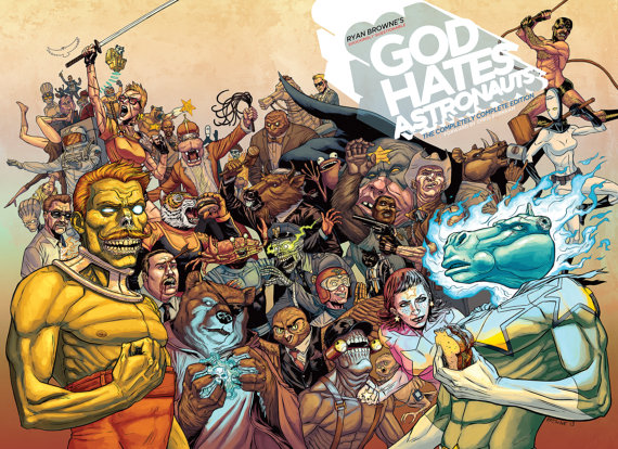 My glorious plan to cover more Kickstarted (Indigogoed and etc., pick your favorite) comics as of late have hit a few snags. While I am not about to deeply ponder the Service Life Cycle of crowd funding, I believe enough time has passed where certain expectations are met. Biggest one in my mind is the actual arrival of the rewards. Kickstarter modeled crow funding unfortunately veered from a place to support people’s creative ideas, like a charity, to becoming a place to preorder comics and video games. When your greatest investment is getting a thing in the mail or an emailed download link, you really pay attention to the average three extra months it takes to actually ship out. While I can by no means change what Kickstarter has become, I just wanted to mention Chris Burnham’s (writer of the web comic Blast Furnace) comic God Hates Astronauts arrived on time…practically a year ago.